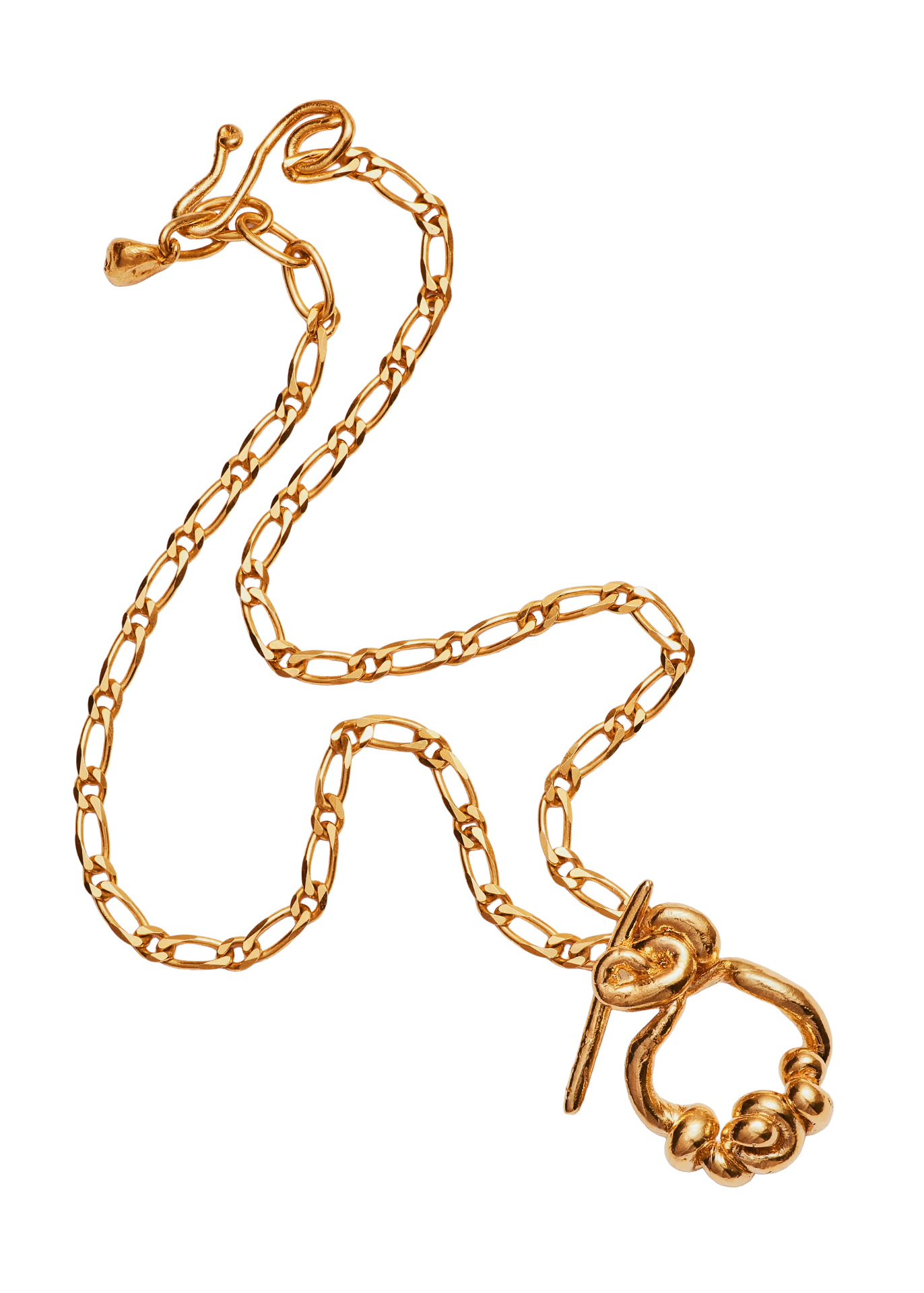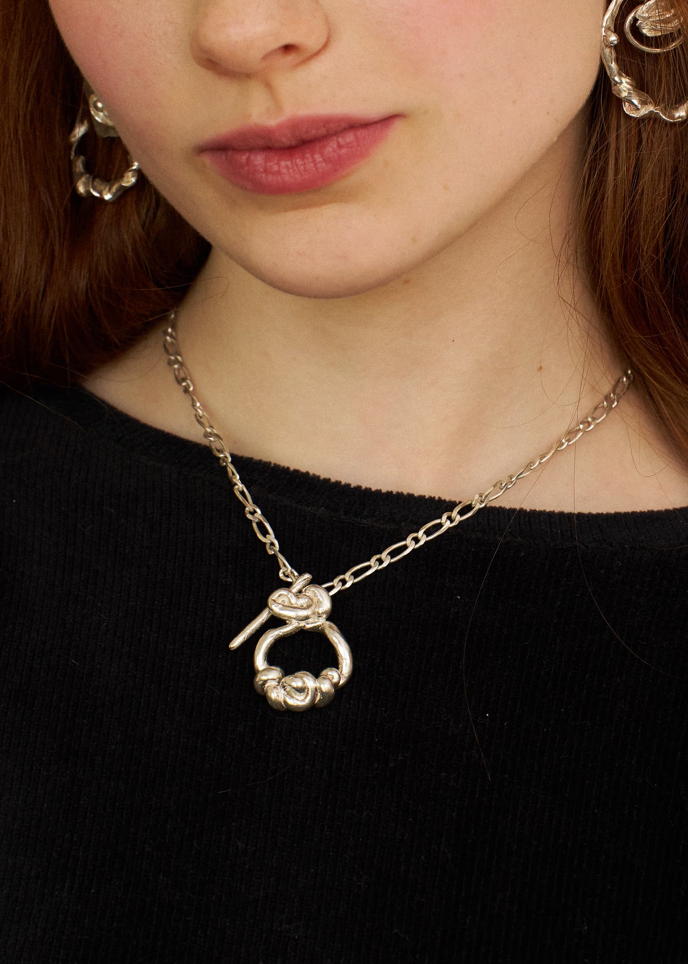 Los colgantes escultóricos y los eslabones llamativos equilibran las formas orgánicas con una refinada sencillez.