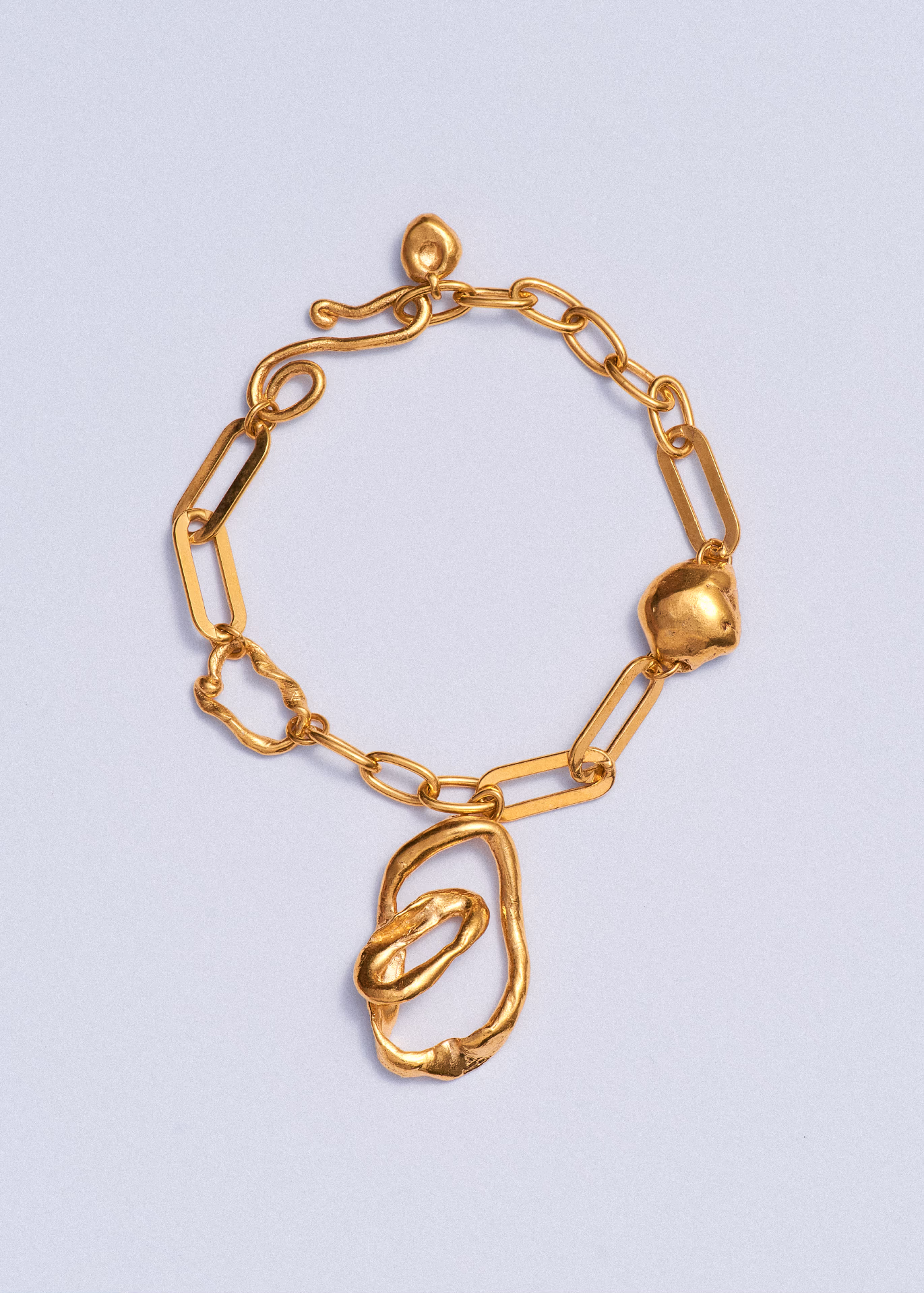 La pulsera Orbit combina distintos tipos de cadena con colgantes hechos a mano y un colgante escultural que se mueve libremente. Cada detalle se moldea a mano, lo que le confiere un aspecto único y orgánico.