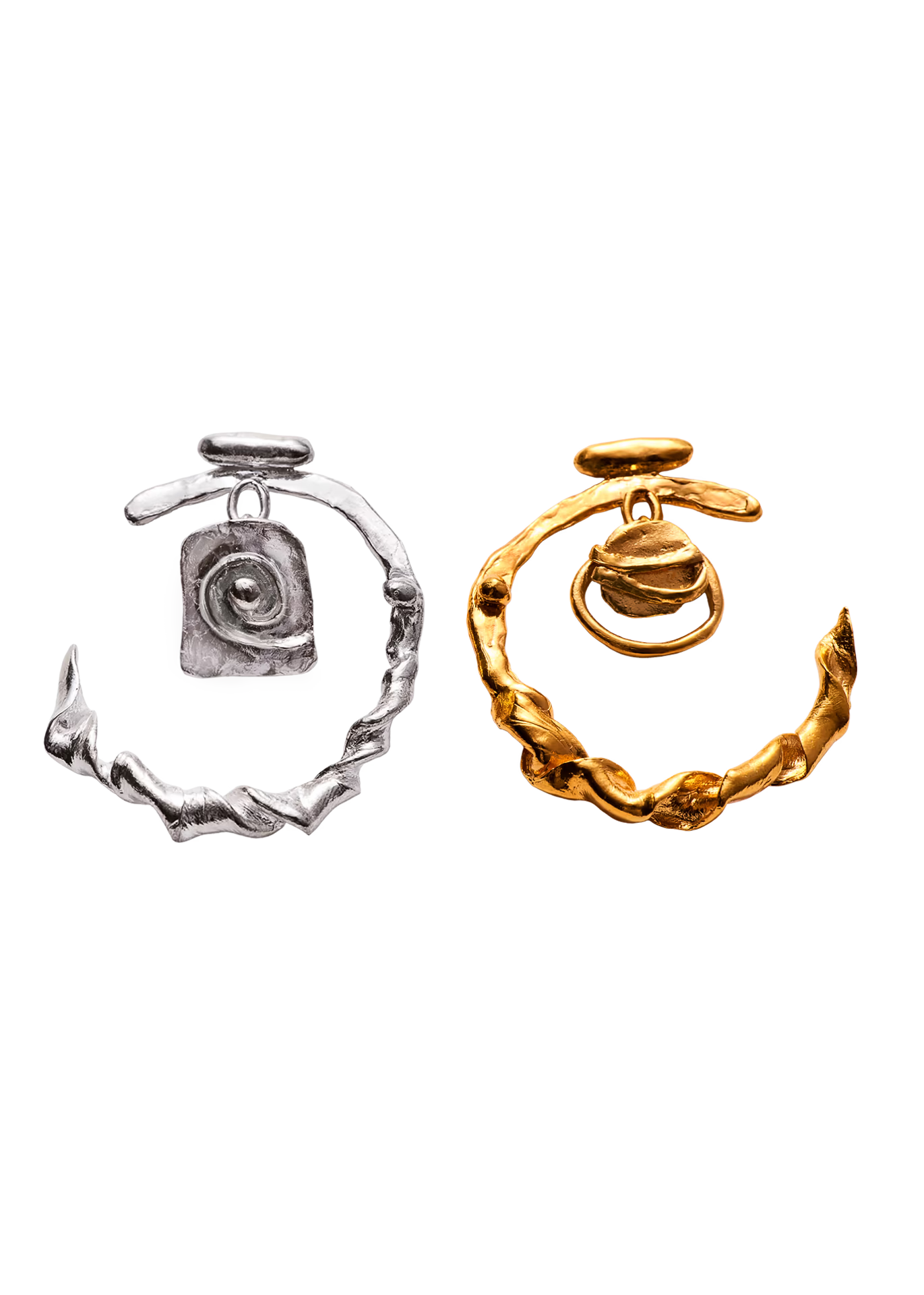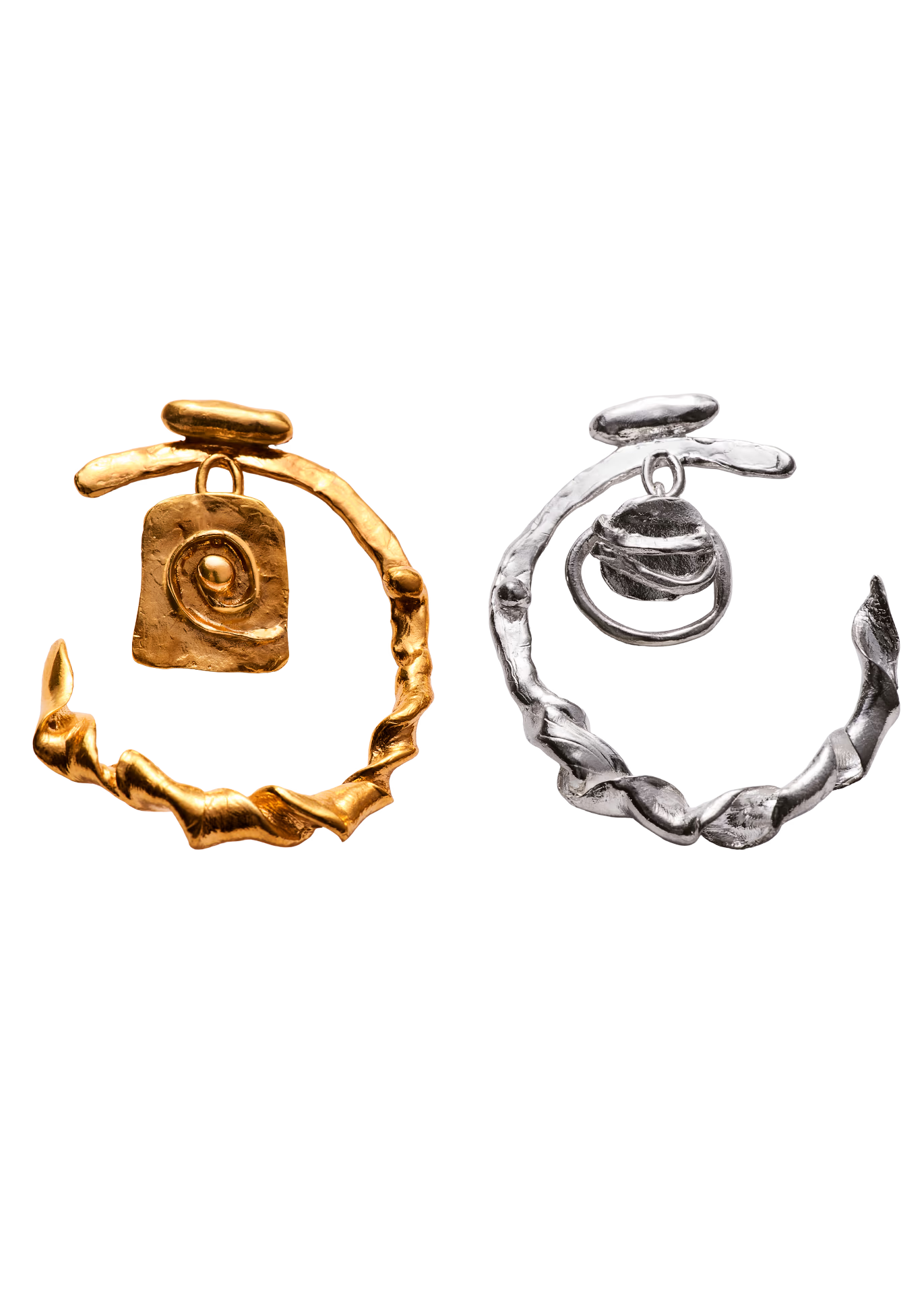 Sculptural, asymmetrical hand-shaped hoops inspired by the clarity and brilliance of the northern star. This mixed pair features one hoop in gold vermeil and the other in 930 silver, creating a striking contrast.