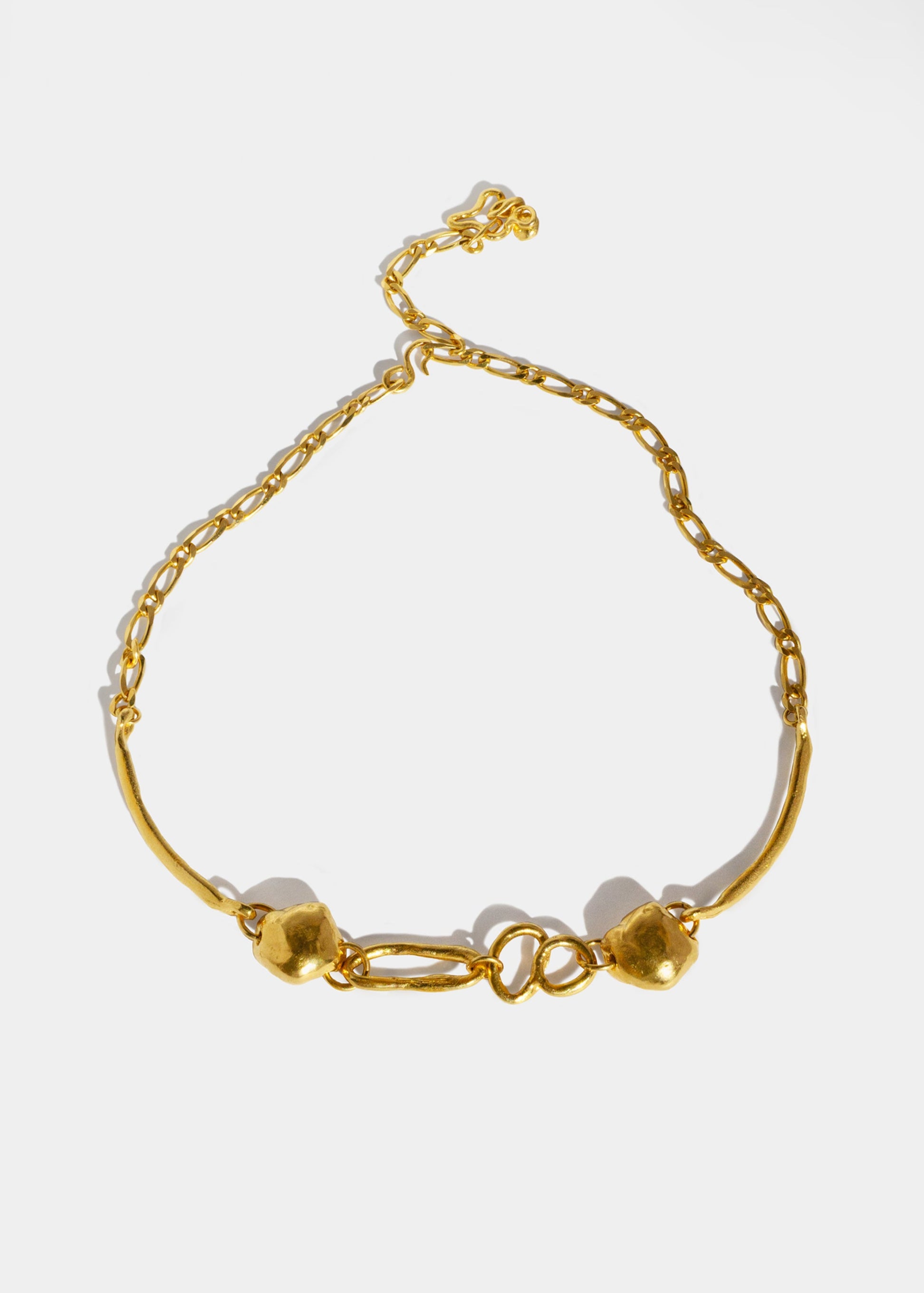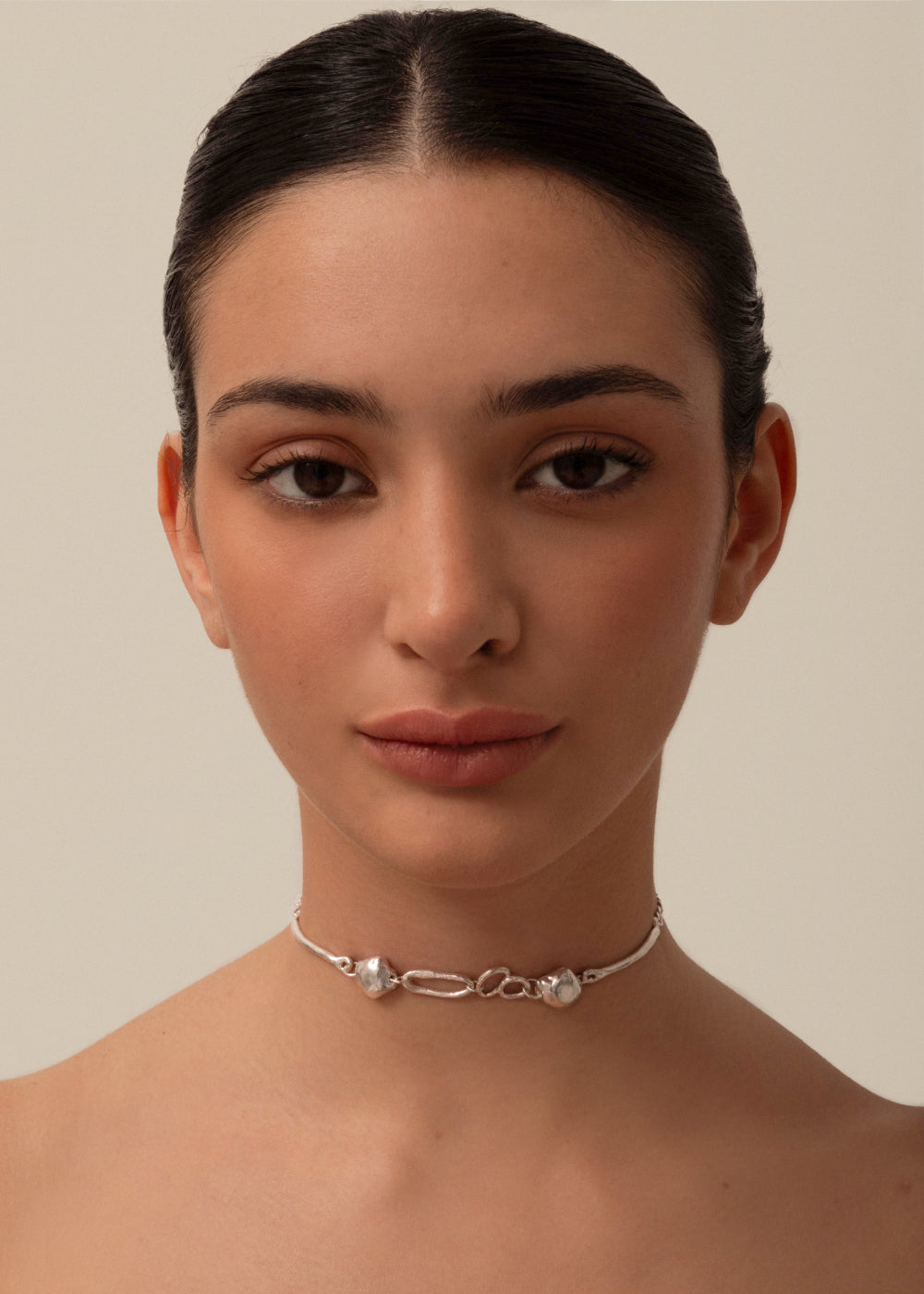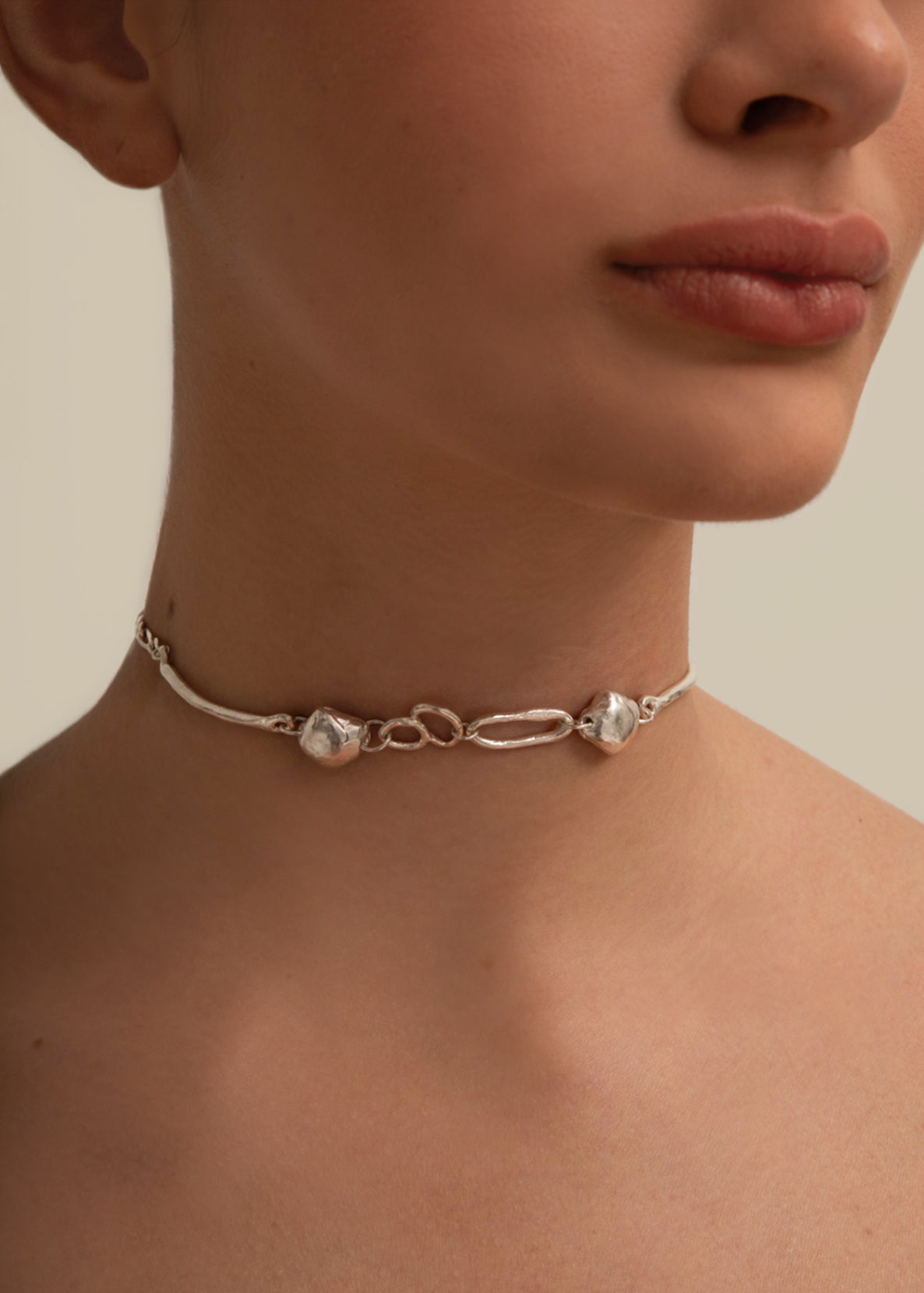 Handmade choker that combines spheric shapes and bold organic links, symbolizing light and shadow in balance.
